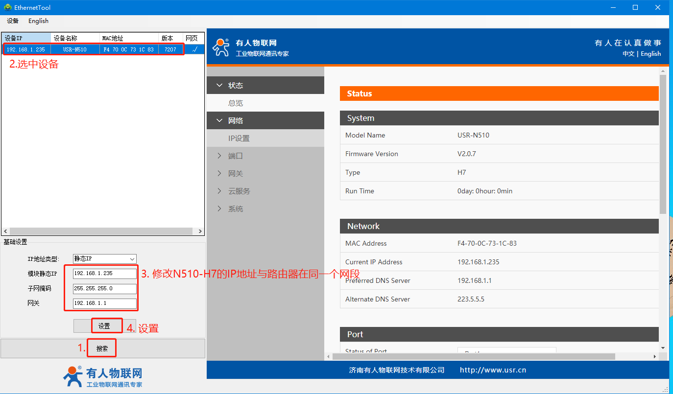 2>打開N510-H7設置軟件,搜索---選中設備---修改IP地址--設置參數