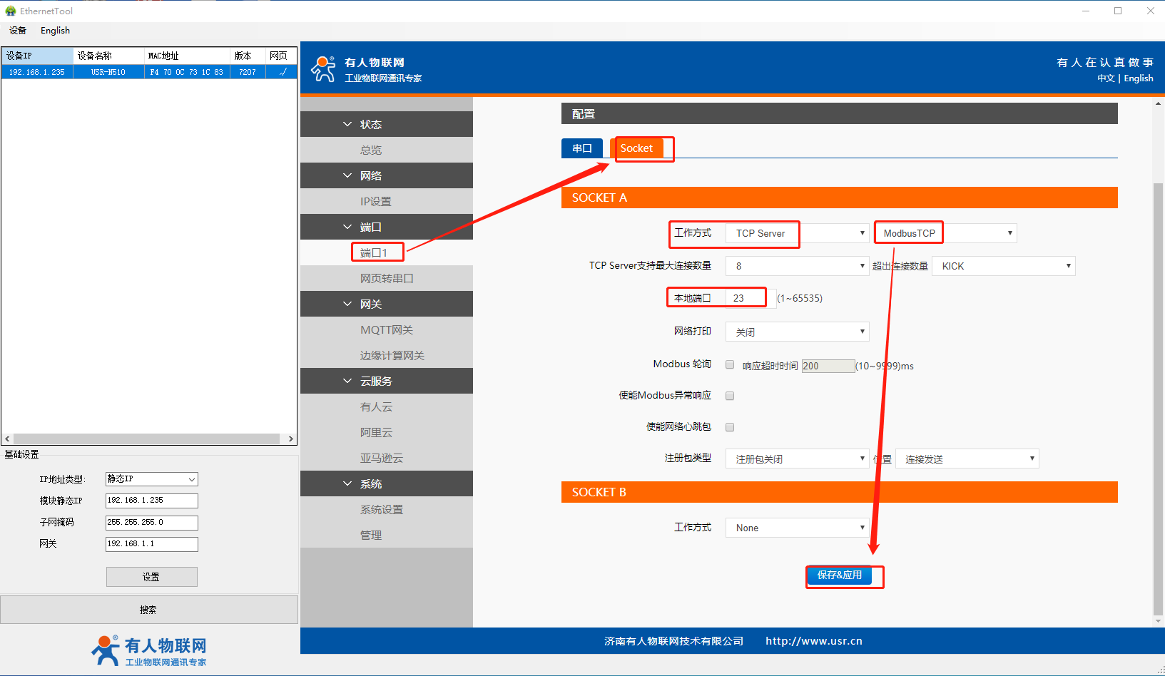 5>設置socket(網絡)參數:在本案例中用的是modbus網關功能,工作方式:TCP Server,啟用modbus TCP功能,其他參數保持默認