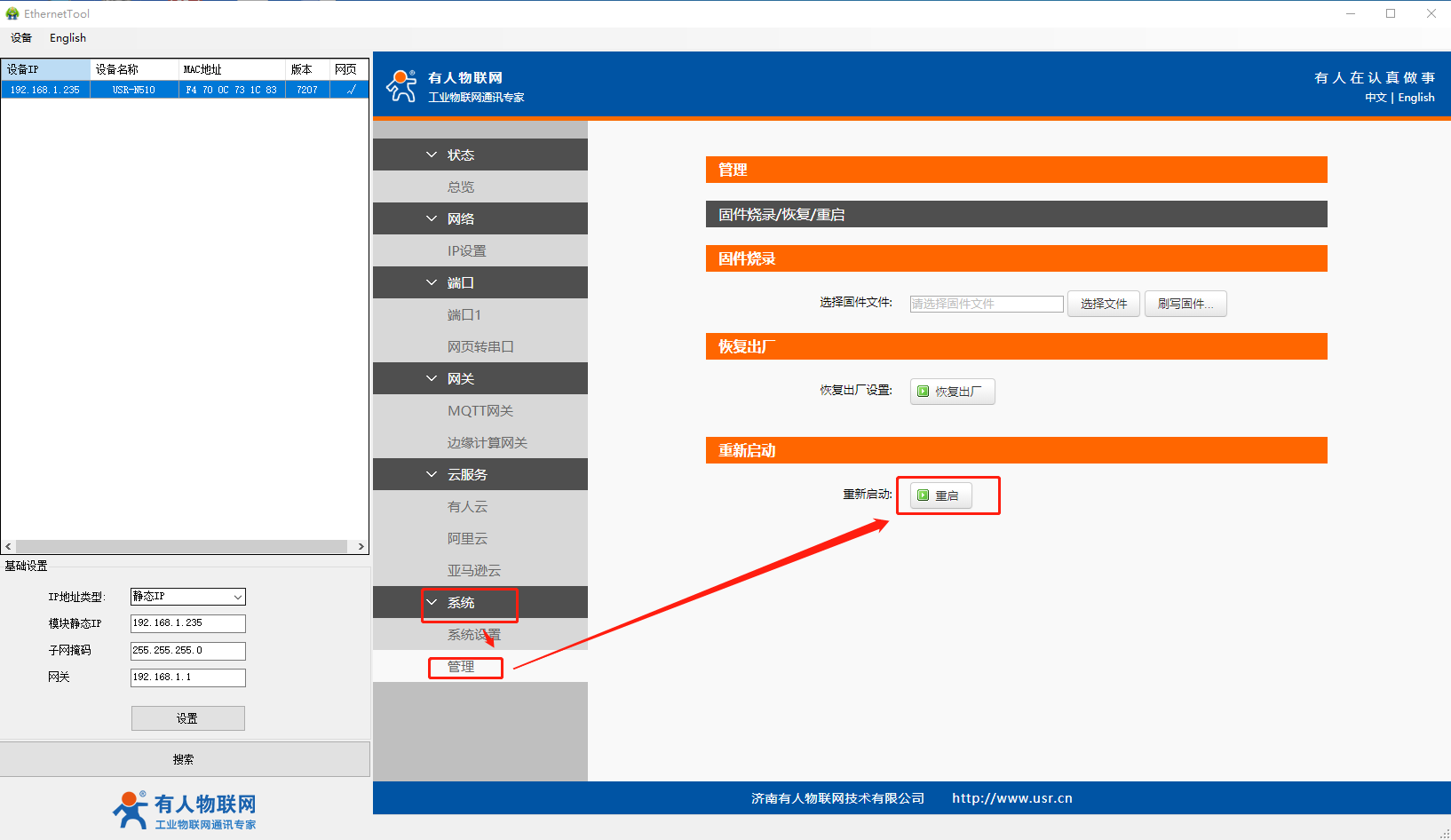 7>重啟N510-H7:系統---管理---重新啟動;等待模塊重新啟動后,可以重新打開設置界面看看,參數是否修改成功。