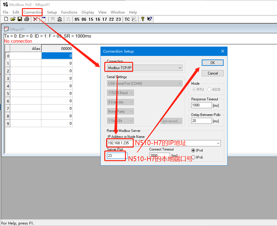 1>硬件連接:N510-H7的串口通過USB轉232/485/422連接到電腦上,電腦和N510-H7接在同一個路由器上