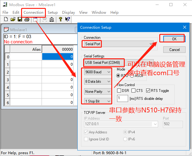 電腦端打開modbus poll和modbus slave軟件,設置軟件參數