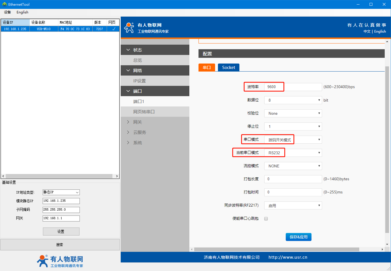 打開串口網絡二合一調試工具,實現串口與網絡端的雙向數據傳輸。
