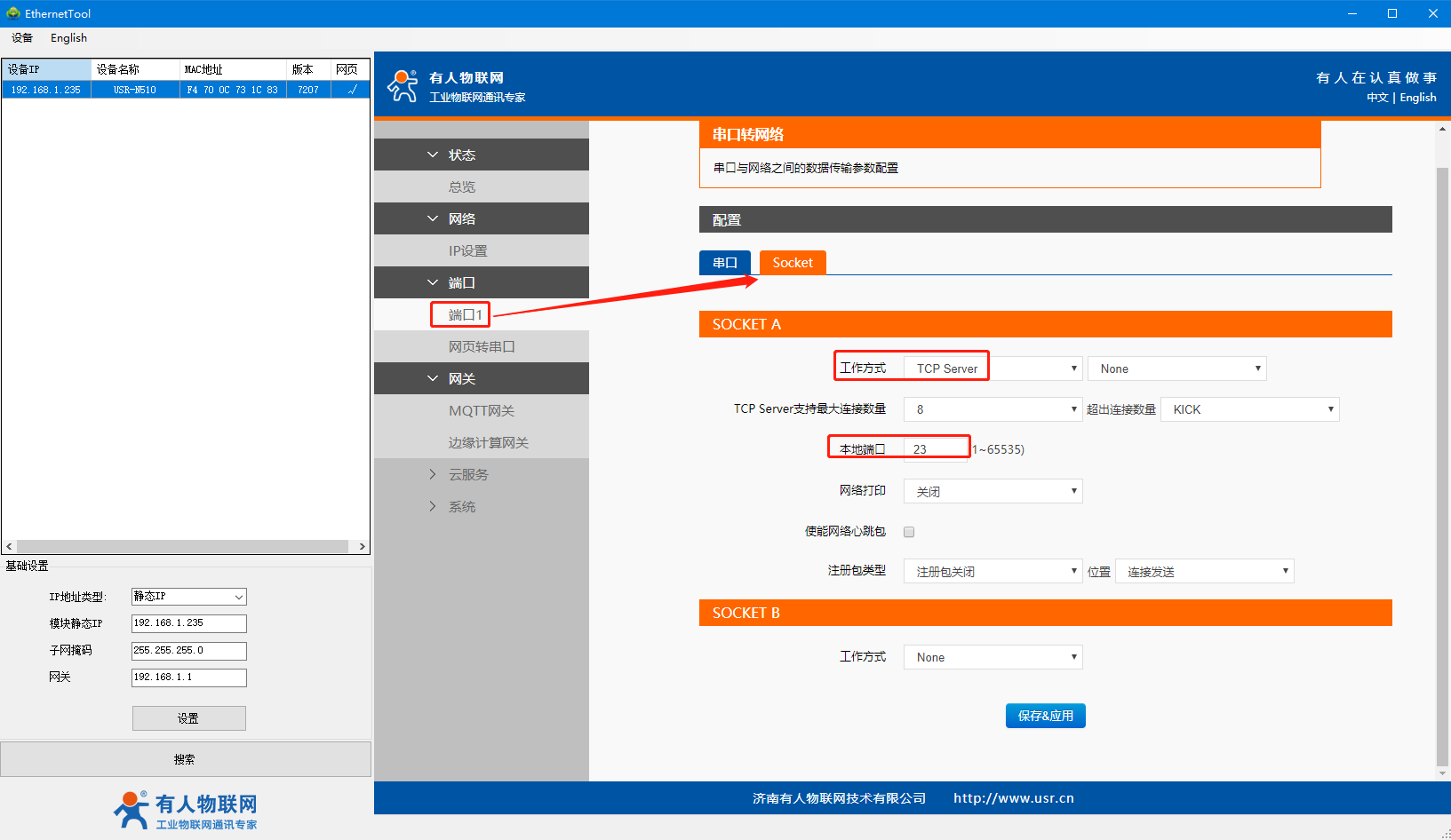 4>設置socket(網絡)參數:在本案例中保持N510-H7的默認參數