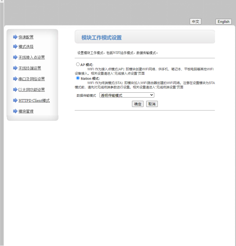 1、登錄之后,在模式選擇中,將USR-W610的工作模式從默認(rèn)AP模式改為STA模式,點(diǎn)擊確定,會(huì)跳出重啟提示,建議不要立刻重啟,需要所有網(wǎng)頁(yè)參數(shù)設(shè)置完畢之后,最后再重啟USR-W610。
