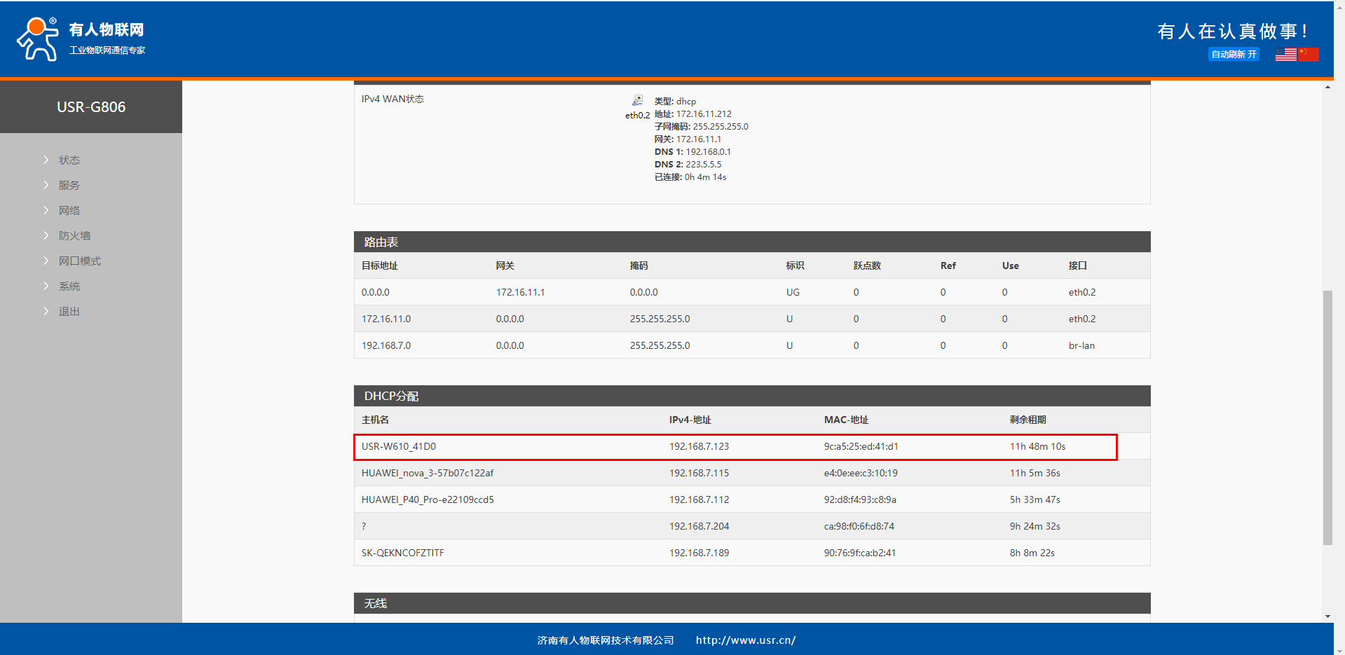2、也可以登錄路由器內(nèi)置網(wǎng)頁(yè)DHCP列表查看路由器給USR-W610分配的IP。
