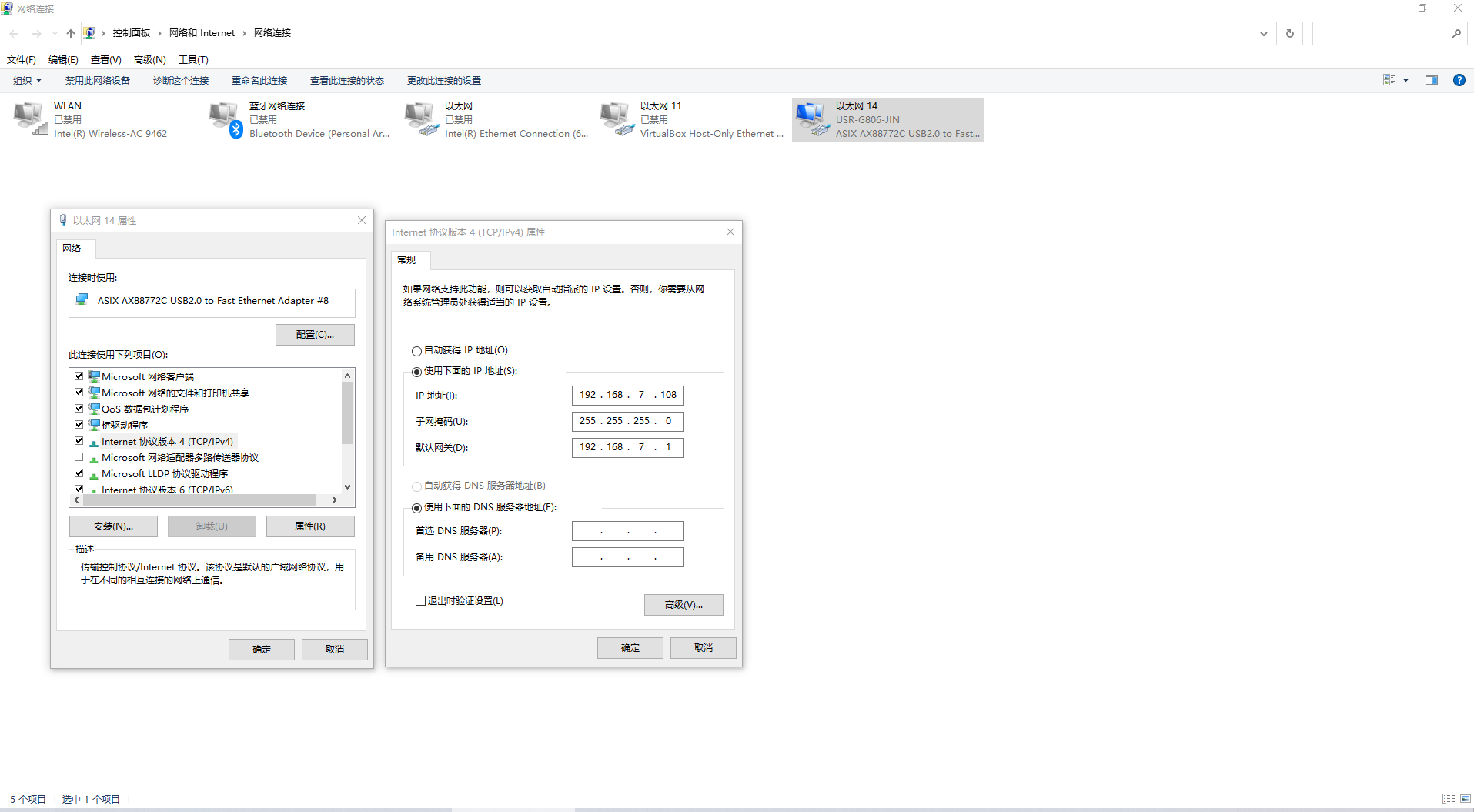 2、第二臺(tái)電腦用網(wǎng)線接路由器網(wǎng)口,本地連接設(shè)置DHCP獲取IP,動(dòng)態(tài)獲取的IP是192.168.7.108。將本地連接DHCP改為靜態(tài)IP,IP:192.168.7.108,子網(wǎng)掩碼:255.255.255.0,網(wǎng)關(guān):192.168.7.1。第二臺(tái)電腦關(guān)閉防火墻,禁用其他網(wǎng)卡。
