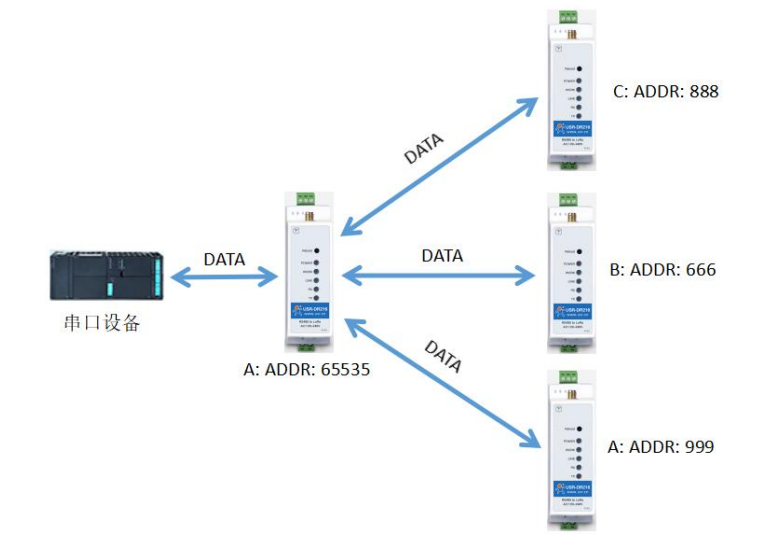 所有設(shè)備工作在透傳狀態(tài),保證廣播發(fā)送的模塊的ADDR為65535,其他設(shè)備與廣播設(shè)備的速率等級、信道參數(shù)相同。