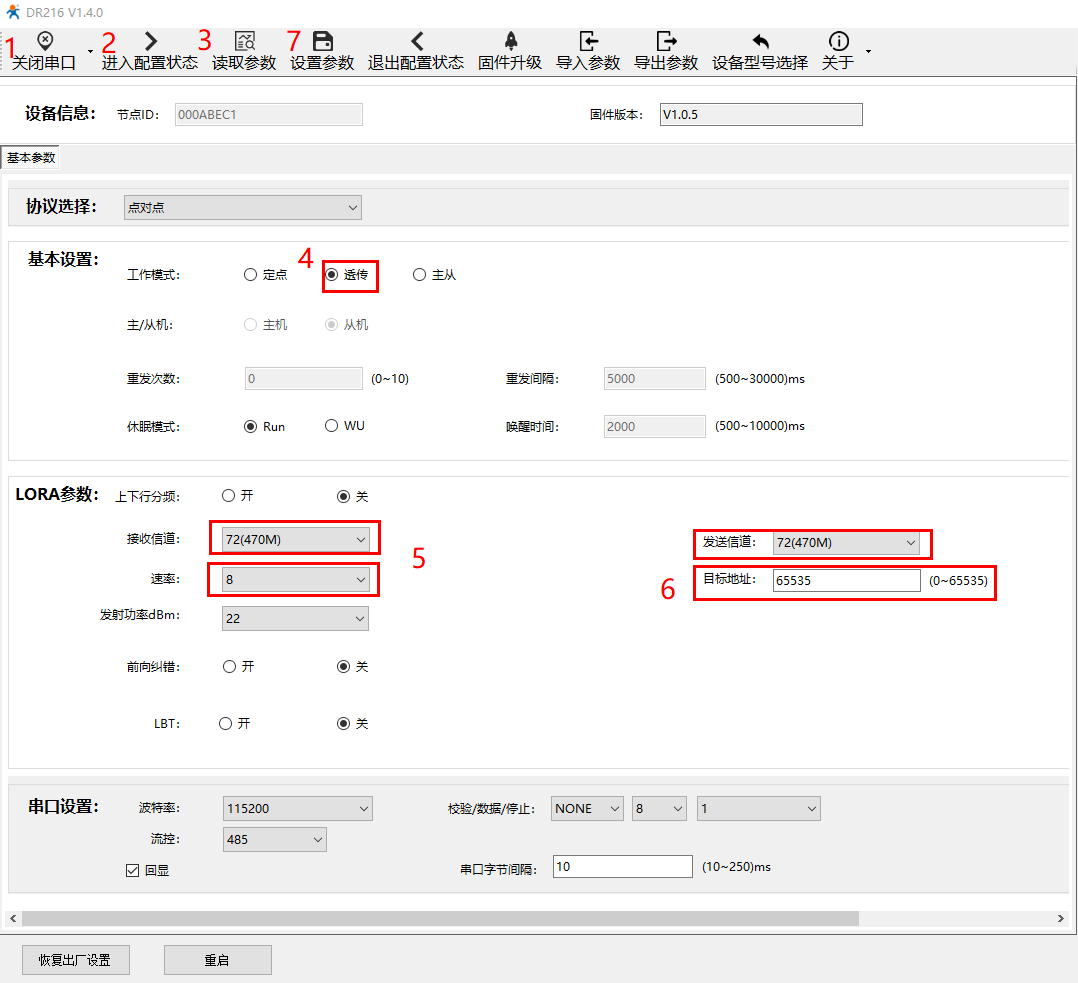根據(jù)上面步驟配置設(shè)備B:透傳模式,速率8,信道72,目標(biāo)地址888。