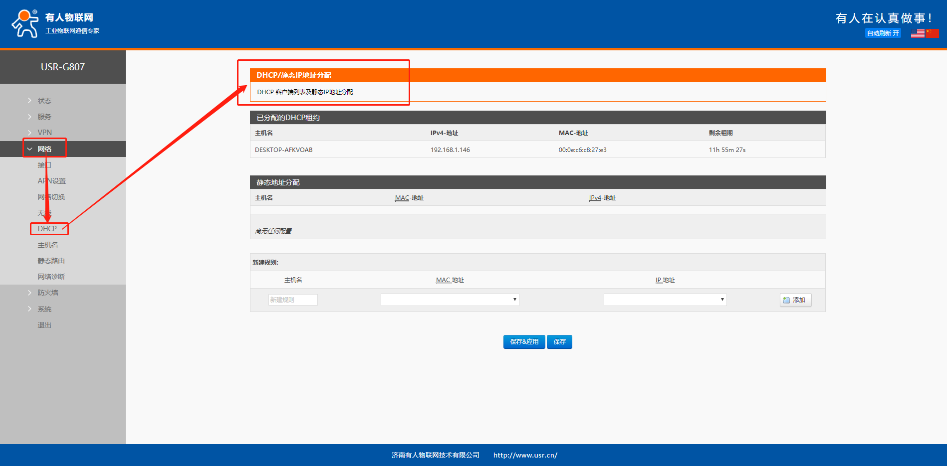 然后點擊保存并應用(若不知道設備MAC,且之前設備是DHCP接入G807,可以在該界面上已分配的DHCP租約看到設備的接入信息)