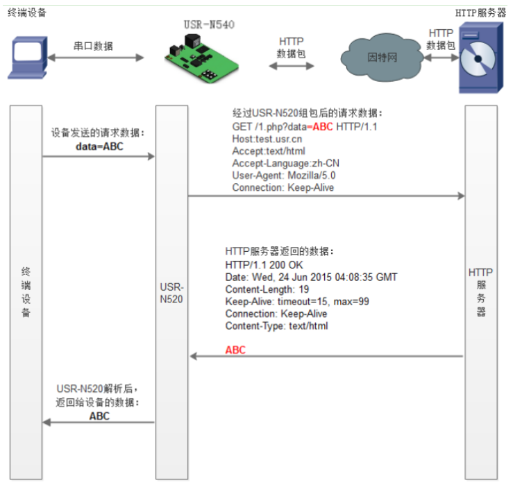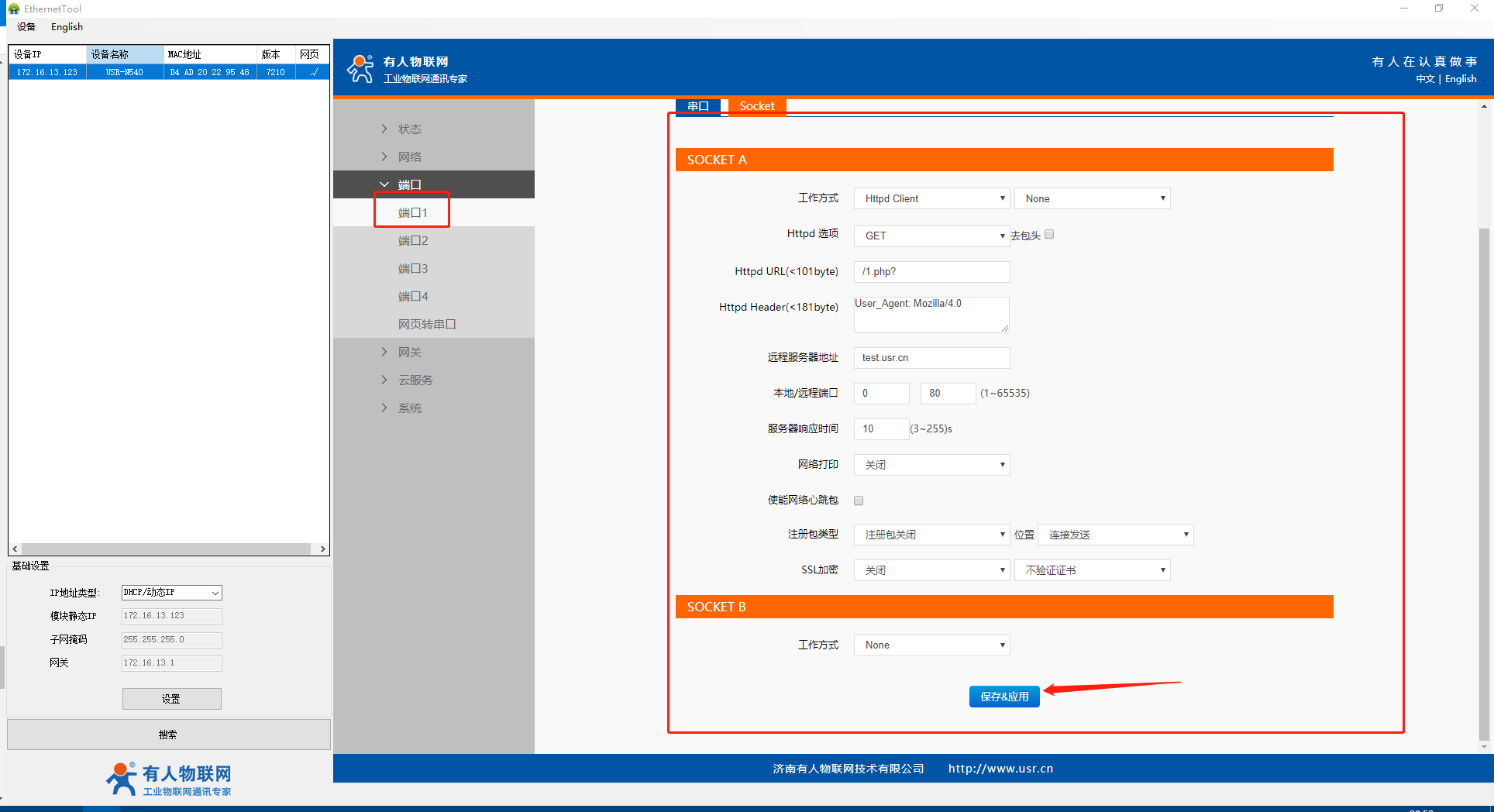 N540端口1工作方式設置HTTPD模式,GET,遠程服務器地址填test.usr.cn,遠程端口填80,本地端口號設置為0。URL填/1.php?,不濾除報頭。