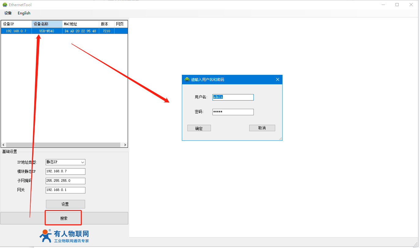 用H7系列配置軟件搜索N540設備,單擊搜索,找到設備之后,單擊產品名稱信息彈出輸入用戶名admin和密碼admin,點擊確定。在右上角點擊中英文切換