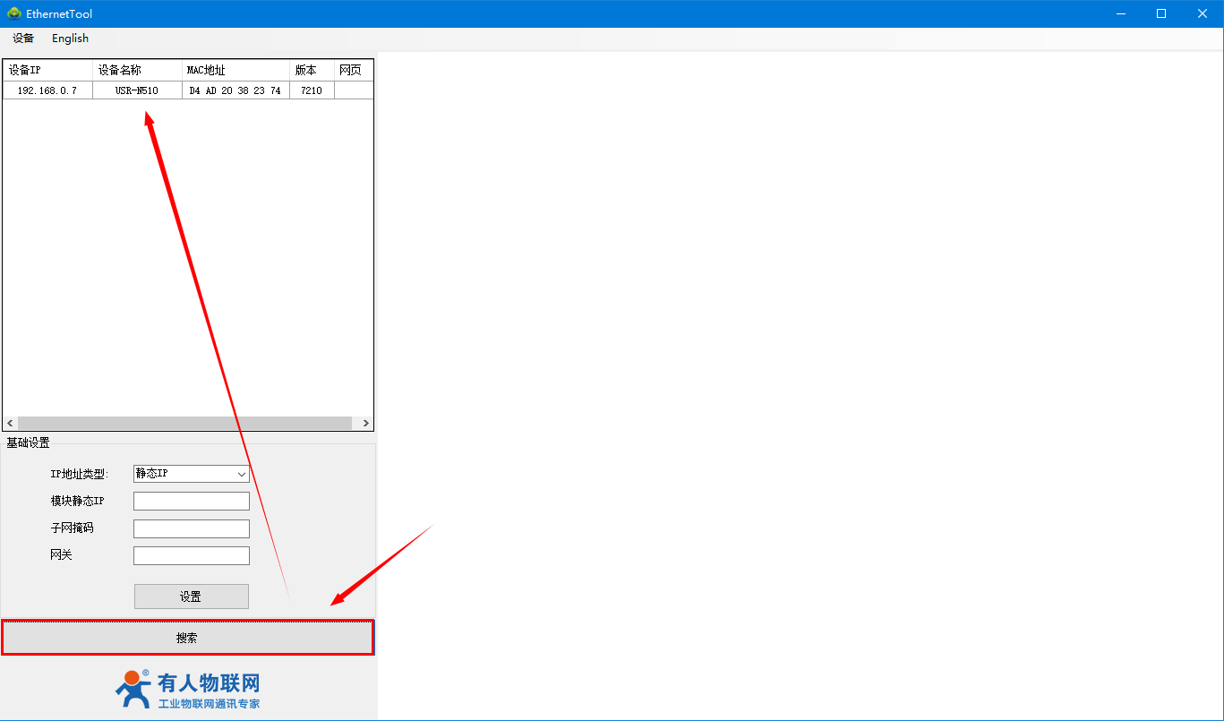 用H7系列配置軟件搜索N510設(shè)備,單擊搜索,搜搜到設(shè)備后雙擊設(shè)備。