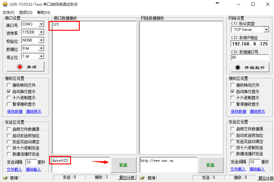 10、N510用485轉(zhuǎn)usb串口線接電腦,用串口調(diào)試助手打開(kāi),串口發(fā)送data=123,服務(wù)器回復(fù)123。