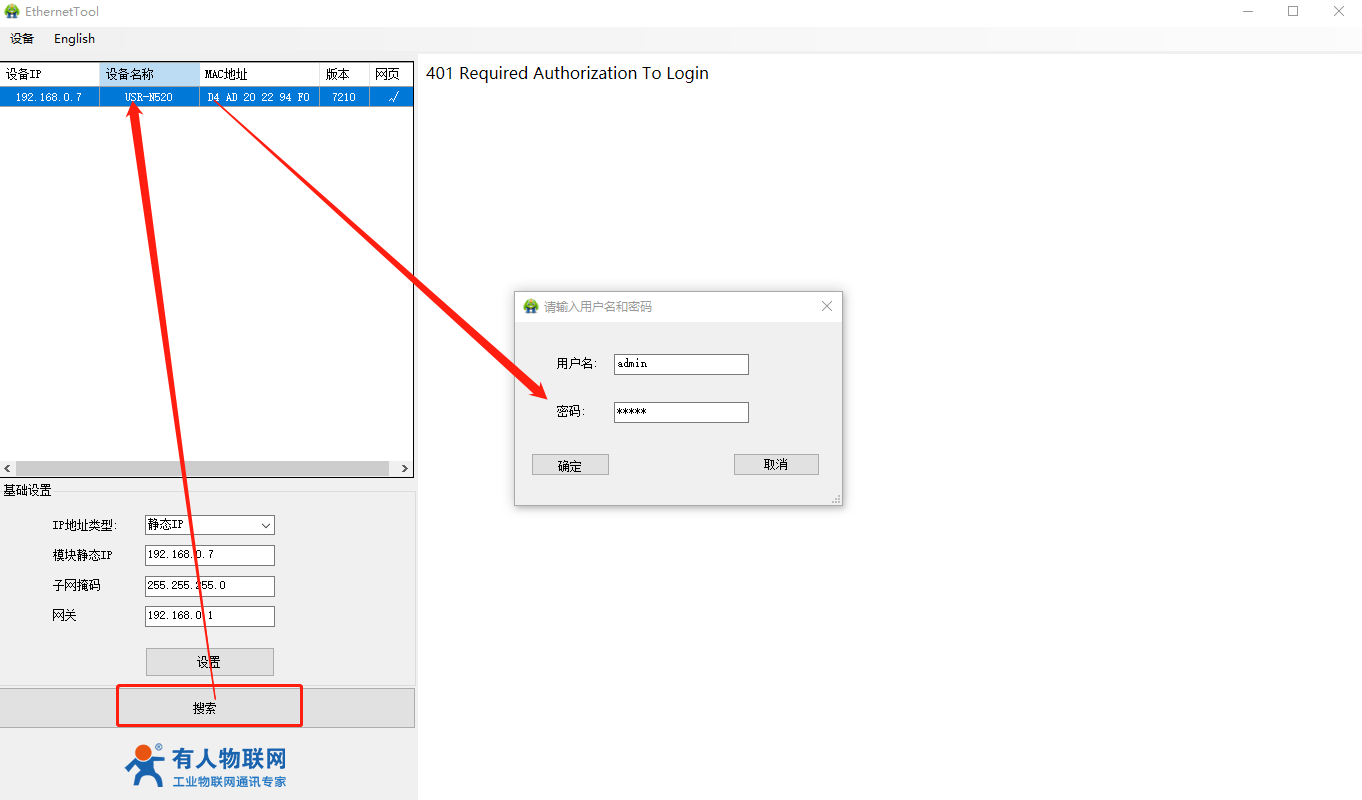3)打開N520-H7設置軟件,搜索----雙擊選中設備----用戶名,密碼出廠默認均為admin