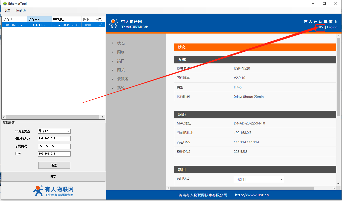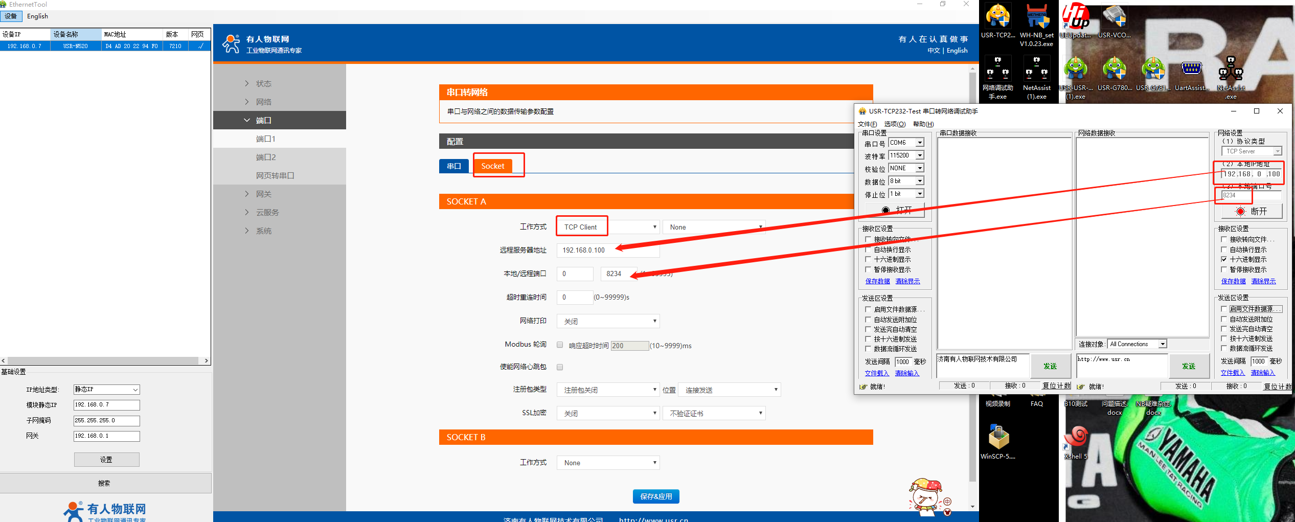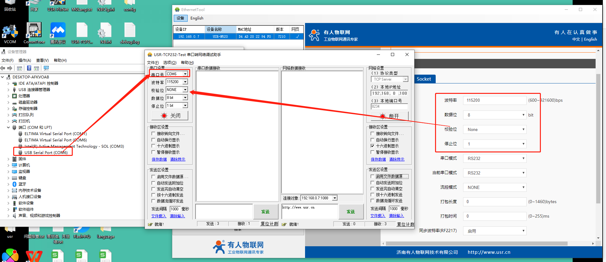 1)硬件連接:N520-H7的串口1通過USB轉232/485連接到電腦USB口,同時N520-H7的網口通過網線也連接到電腦網口上