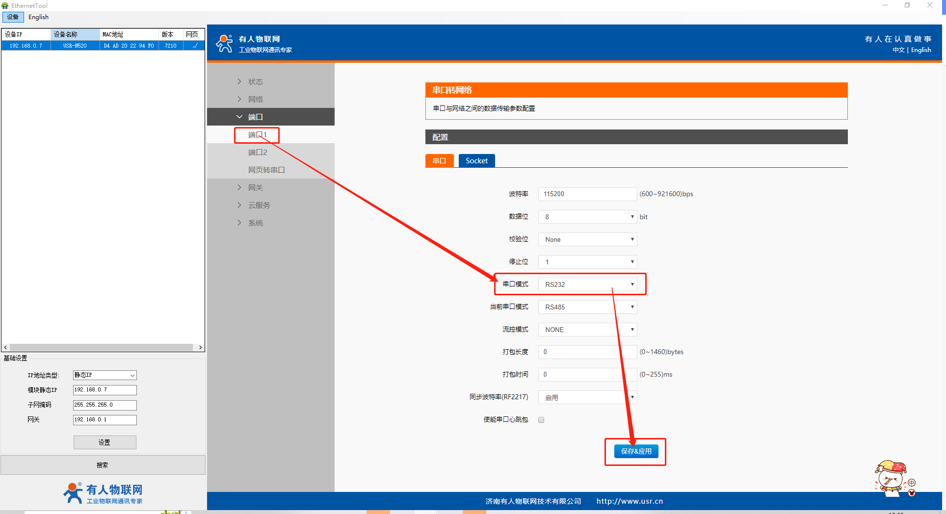 6)打開設置軟件,在端口處設置設備參數,此處使用串口1的322串口進行測試,所以需要選擇端口1(若使用串口2,則選擇端口2即可),串口模式選擇RS232(若使用485串口,串口模式選擇RS485即可),設置完此界面點擊下方保存并應用,彈出提示后選擇繼續配置,所有參數都設置完之后再重啟就可以