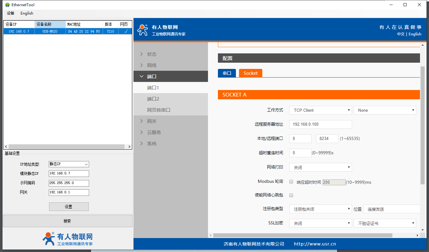 7)繼續在軟件中配置socket參數,工作方式選擇tcp client,將服務器的IP以及端口填入到設備中,設置完成后點擊保存并應用。全部參數設置完成后,點擊重啟。參數重啟后生效