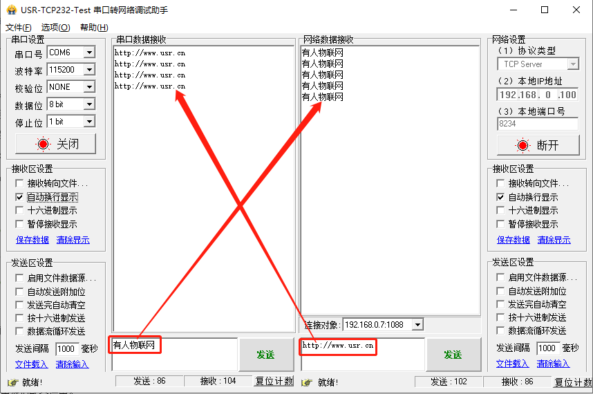 11)串口發送任意數據,可以在網絡服務器接收,網絡服務器下發的任意數據,也可以在串口接收。證明數據雙向透傳沒有問題,至此測試結束