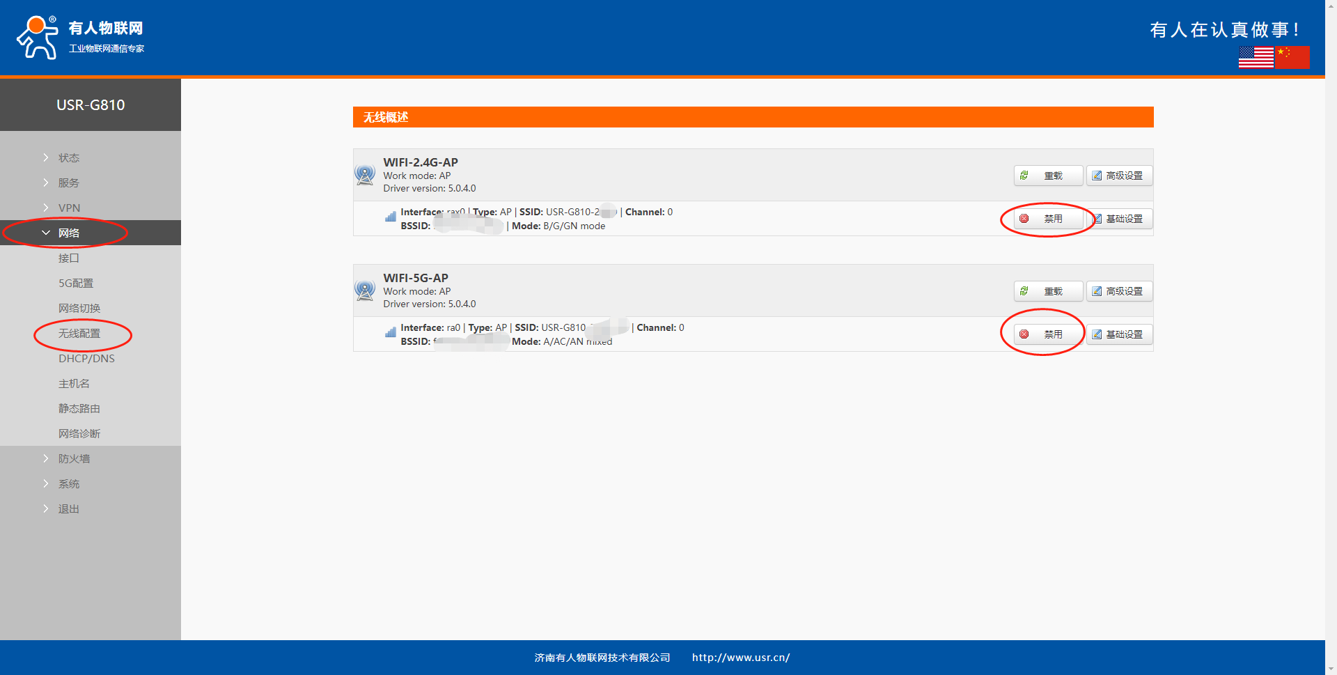 G817G816w:網絡--無線--2.4G配置/5.8G配置--啟用(取消勾選)--應用