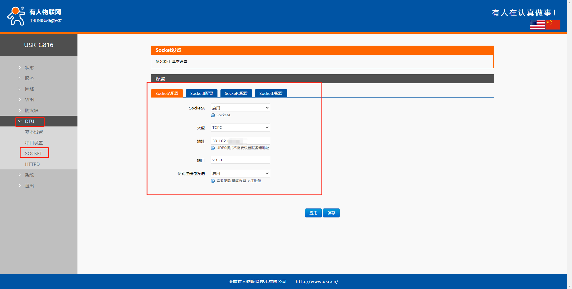 開啟SOCKET功能,設置服務器的IP地址以及端口號,然后點擊應用