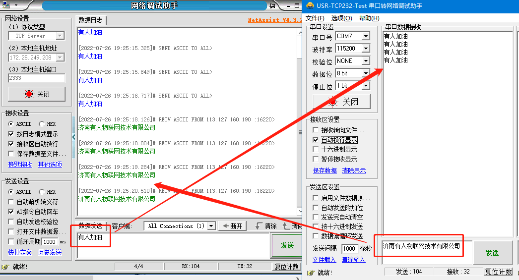 6.數(shù)據(jù)收發(fā)測試:等待G816重啟成功,和服務器建立連接,在電腦端和服務器端分別打開串口網(wǎng)絡二合一調(diào)試助手,實現(xiàn)G816的串口和服務器端的數(shù)據(jù)通訊。