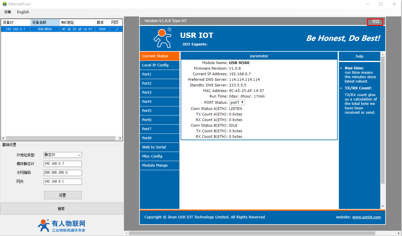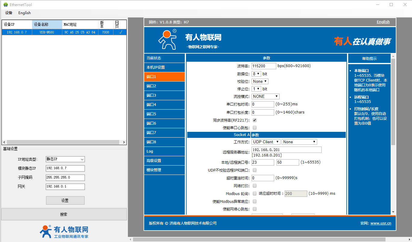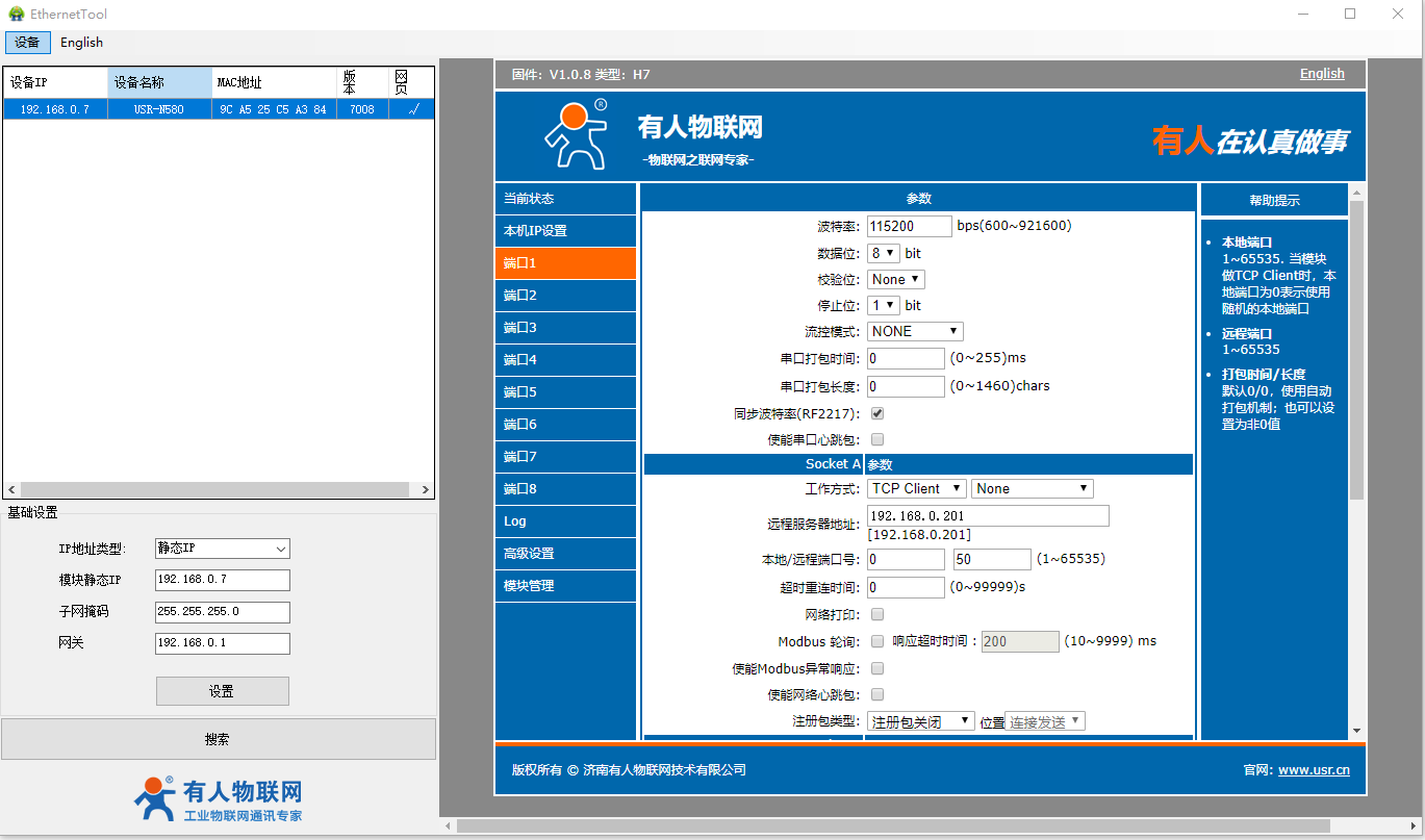 顯示IP 192.168.0.7之后,鼠標單擊產品信息,基礎設置顯示IP類型、IP、子網掩碼、網關信息。