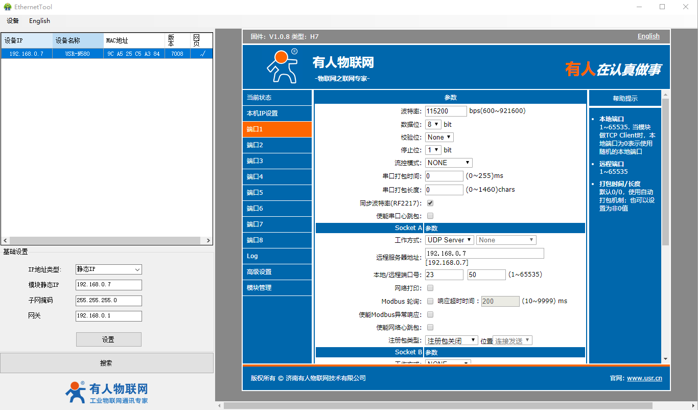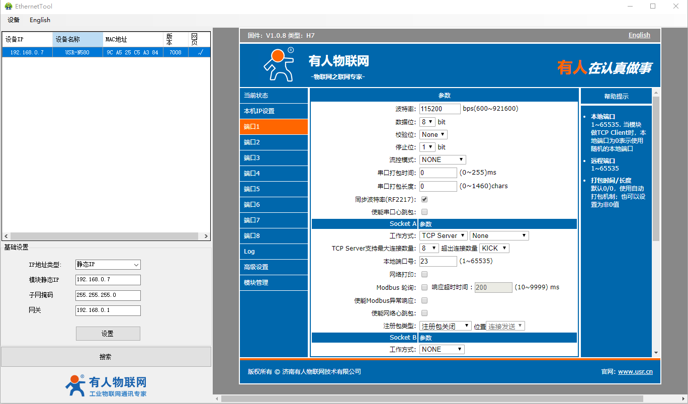 N580 RS485串口做TCP server,電腦下載的串口網絡助手,左側用COM口打開,串口參數(shù)和RS485串口參數(shù)保持一致,波特率、數(shù)據(jù)位、停止位、校驗位。右側用TCP client打開,服務器IP填N580的IP,服務器端口填N580的端口23。