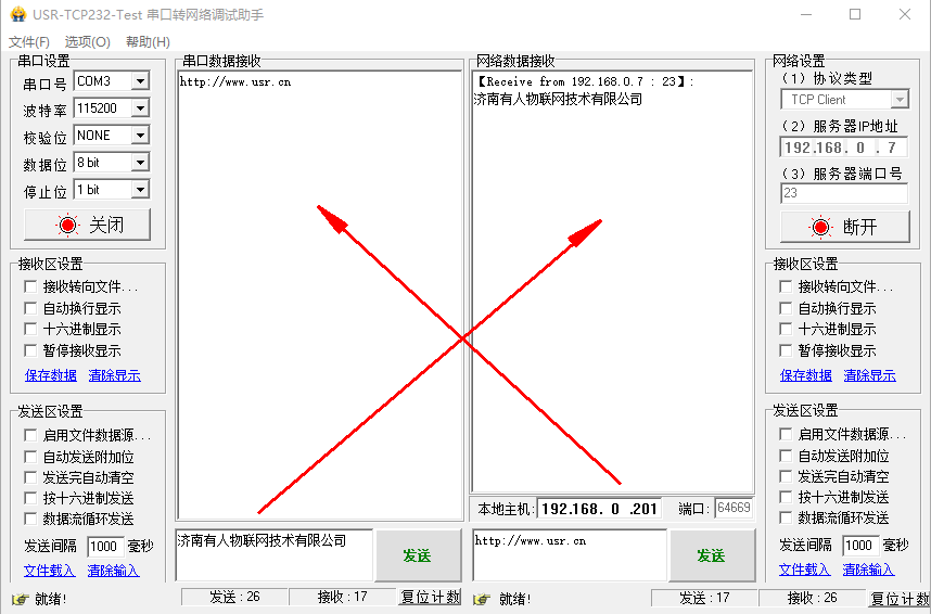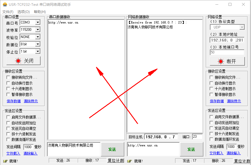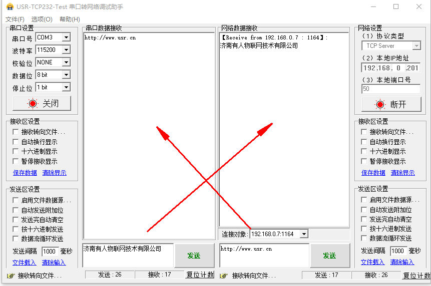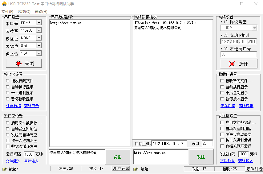 點擊連接,有連接對象之后,測試串口和網絡之間的數(shù)據(jù)傳輸。