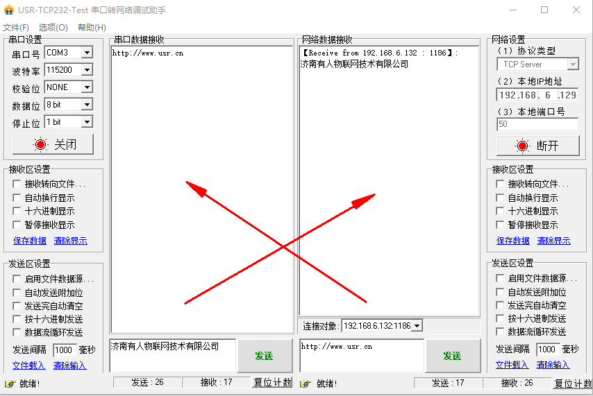 點(diǎn)擊連接,有連接對(duì)象之后,測(cè)試串口和網(wǎng)絡(luò)之間的數(shù)據(jù)傳輸。