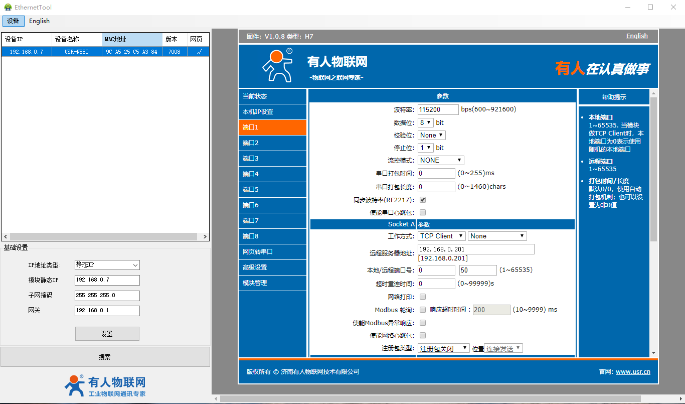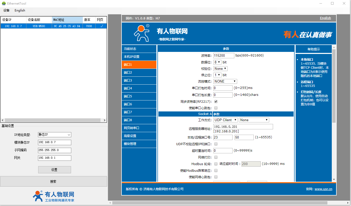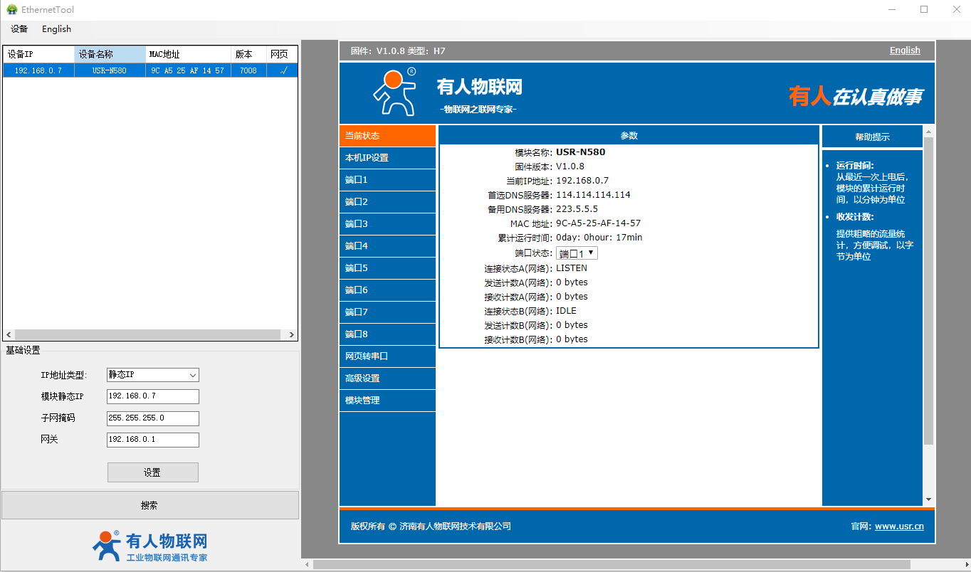 顯示IP 192.168.0.7之后,鼠標單擊產品信息,基礎設置顯示IP類型、IP、子網掩碼、網關信息。