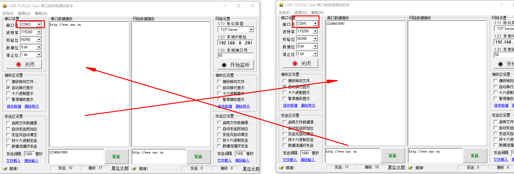 打開2個串口網絡助手,一個用USB-RS485 串口線實際COM口打開,串口參數和RS485串口參數保持一致,波特率、數據位、停止位、校驗位。
