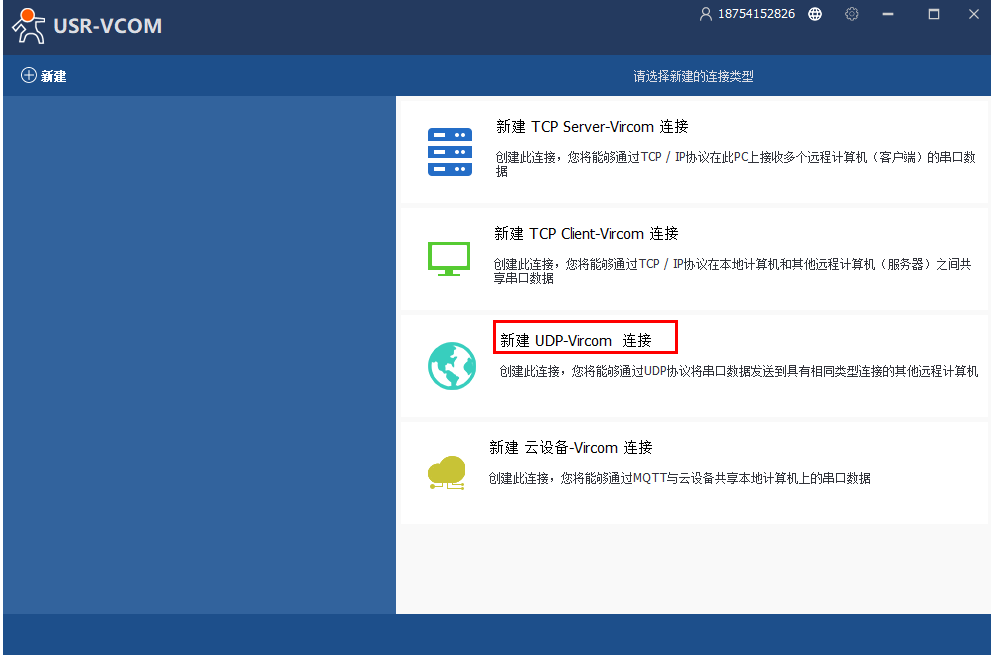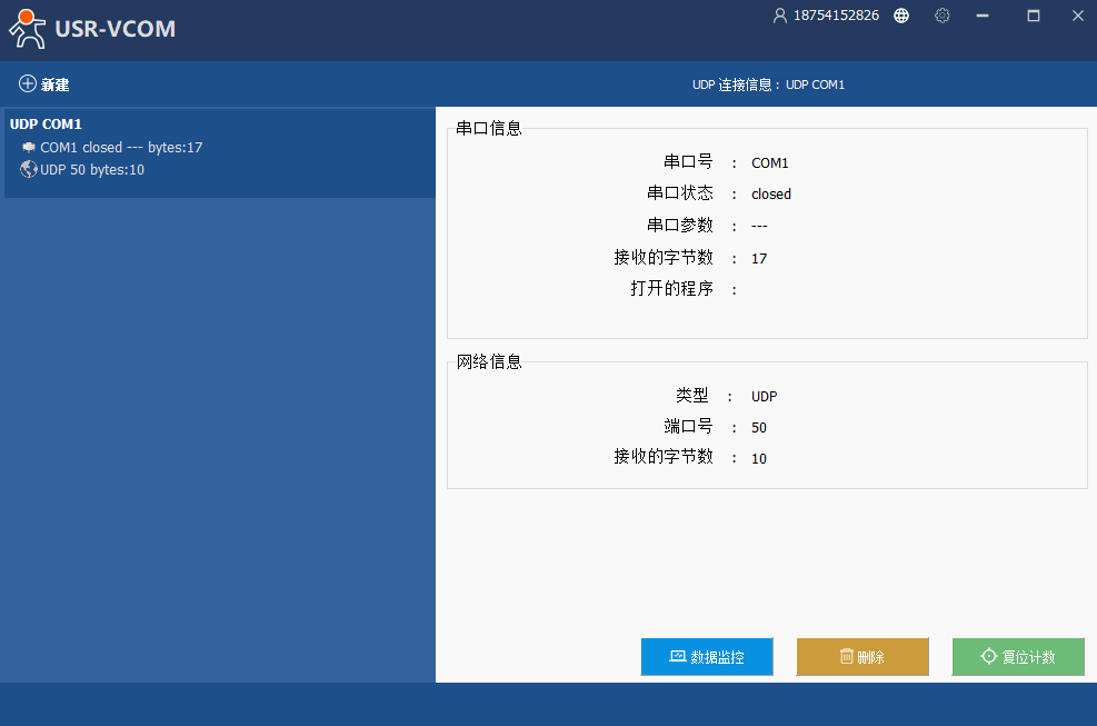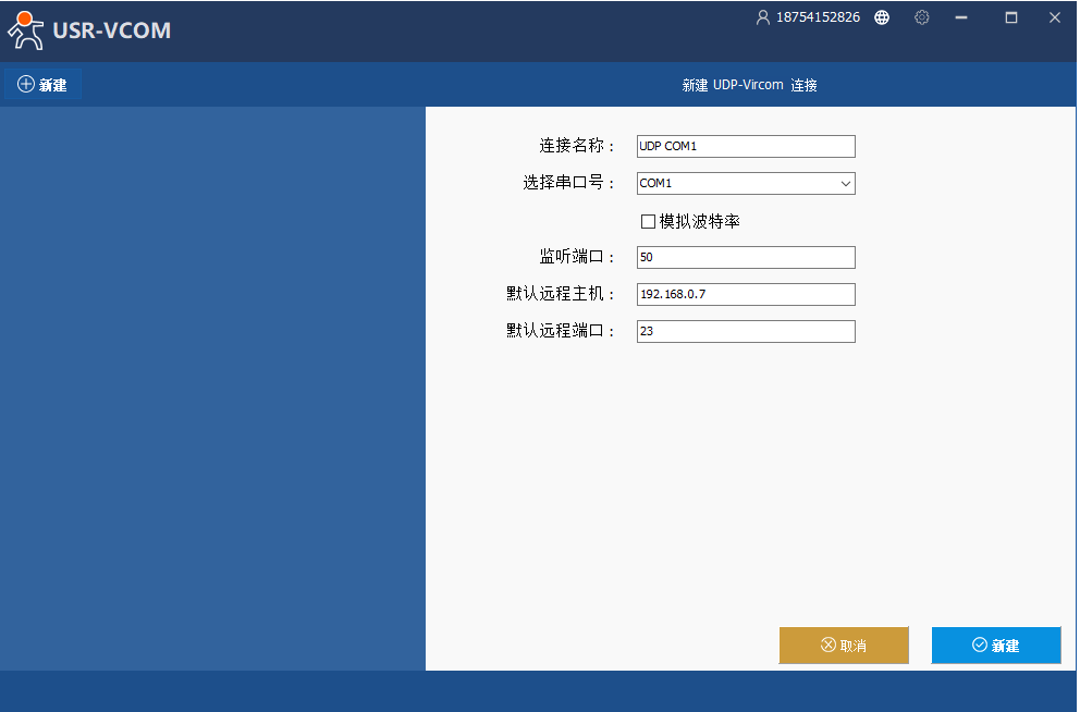 電腦下載的虛擬串口軟件,新建UDP-Vircom連接,添加一個虛擬串口COM1。遠程IP填N580的IP,遠程端口填N580的端口23。監聽端口號填50。