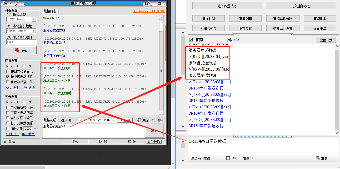 4、如果使用AT+SOCKALK顯示已經連接而對方服務器沒有接收到的話,可以嘗試使用網絡端調試連接測試服務器