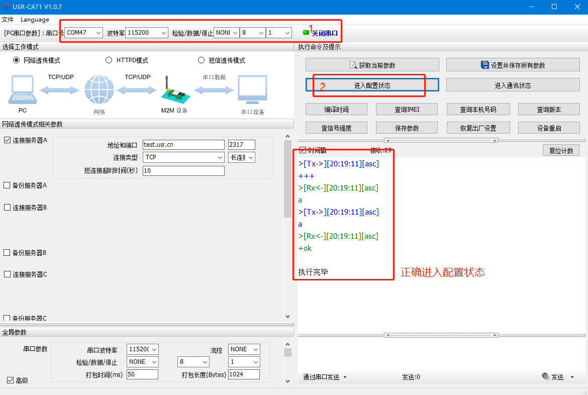2、確認是打開串口--進入配置狀態下設置的參數,不在配置狀態下填寫的參數不生效,如無法進入配置狀態個根據附件二排查