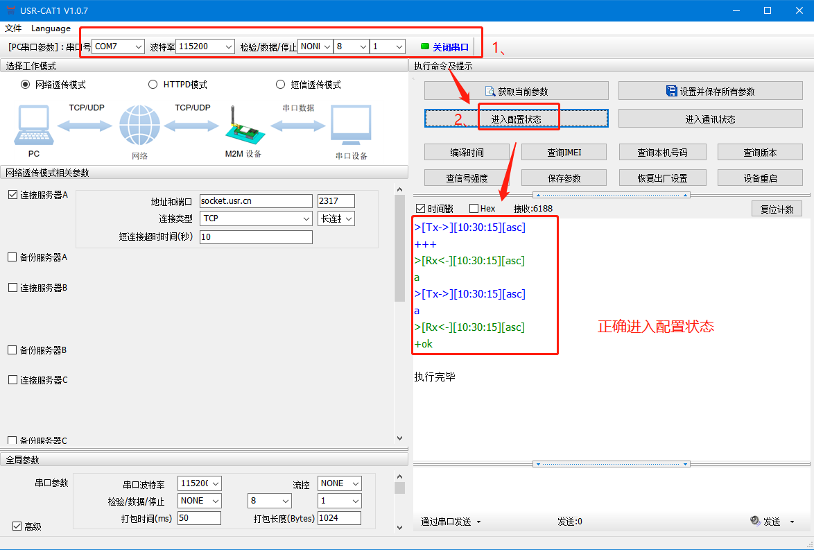 2、確認是打開串口--進入配置狀態下設置的參數,不在配置狀態下填寫的參數不生效,如無法進入配置狀態個根據附件二排查設置完參數需要保存重啟,確認一下是否保存重啟。