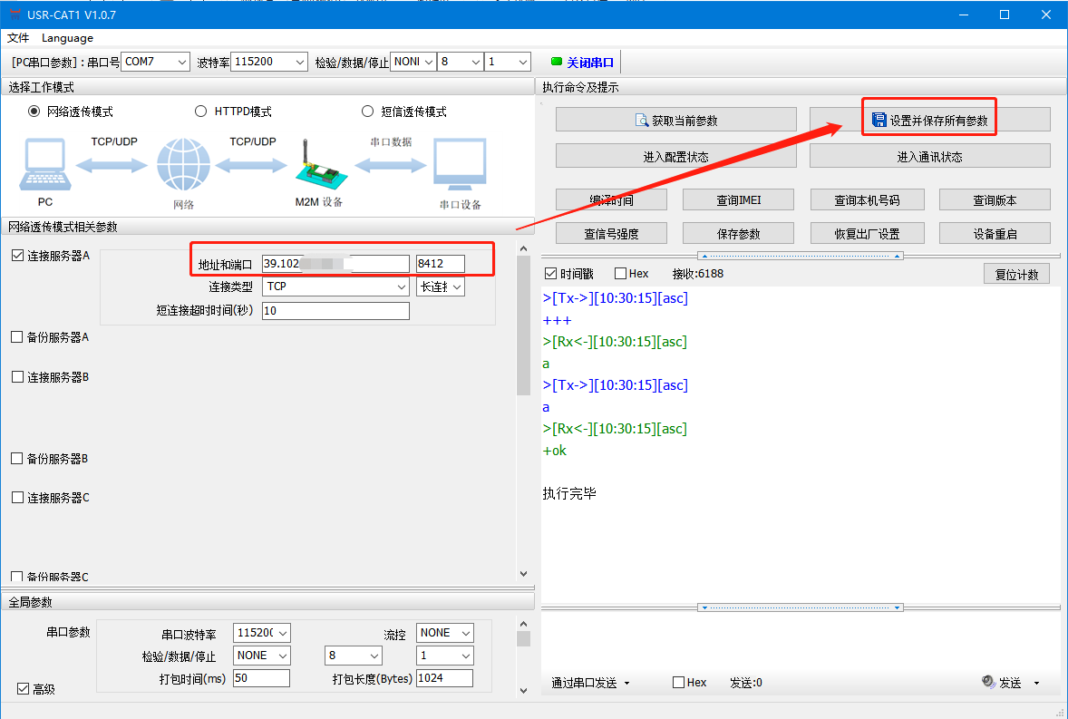 2>設置服務器A的地址和端口,修改參數后,設置并保存所有參數,等待模塊重啟成功。