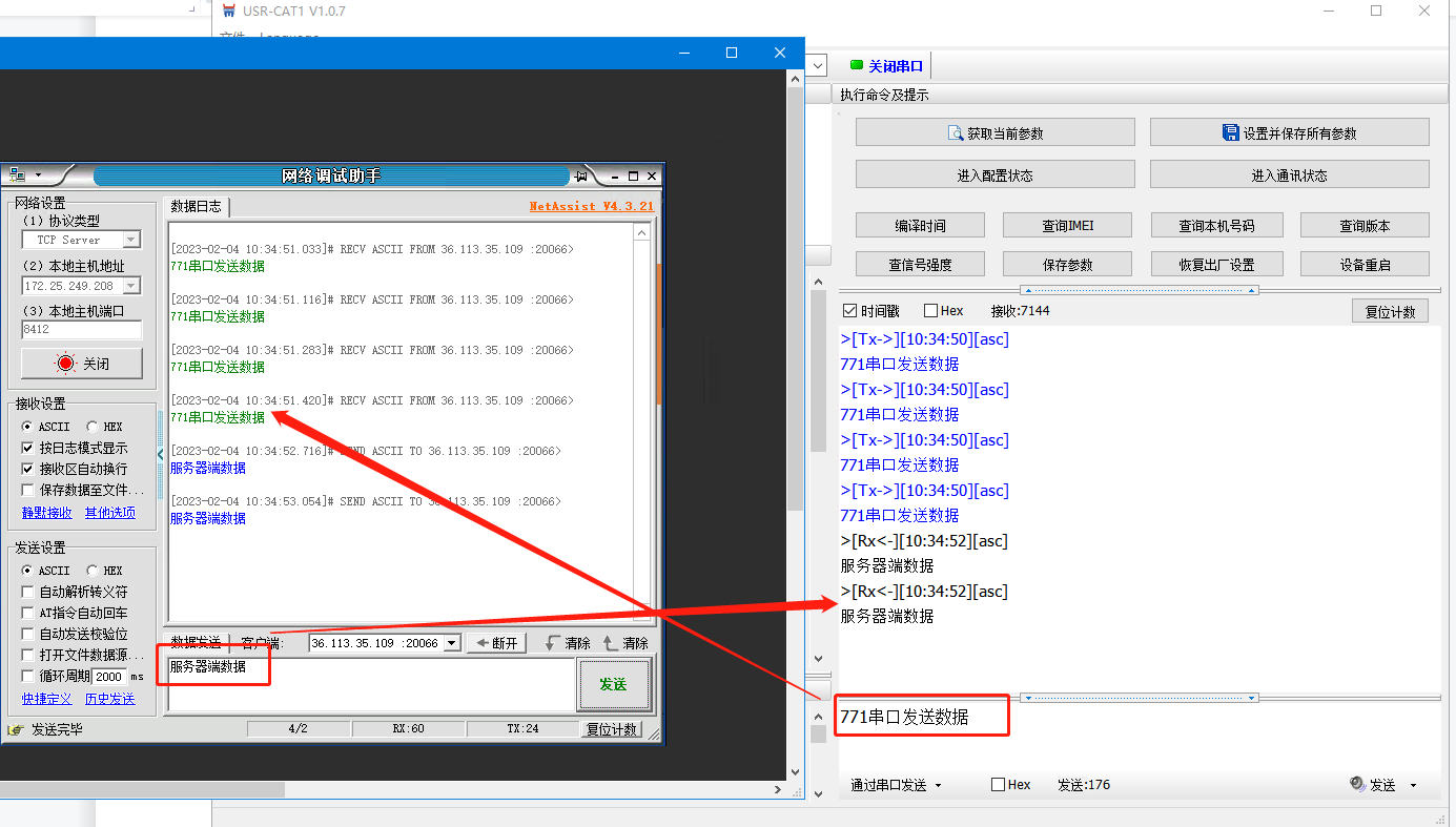 4、如果使用AT+SOCKALK顯示已經連接而對方服務器沒有接收到的話,可以嘗試使用網絡端調試連接測試服務器
