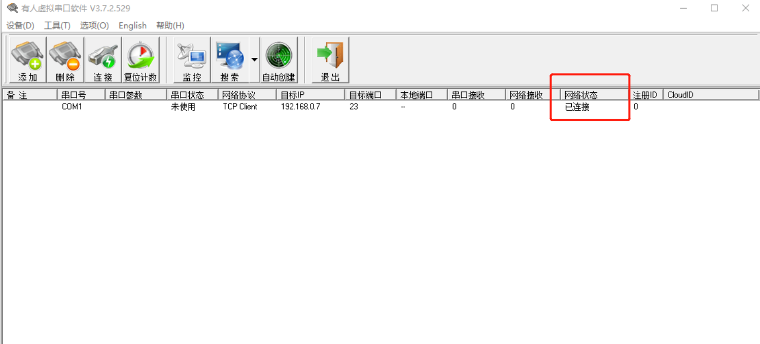 (1) 打開虛擬串口,設(shè)置點(diǎn)擊添加串口,選擇串口號為 COM1(選擇 COM 號一定要避開已經(jīng)存在的 COM 口) 網(wǎng)絡(luò)協(xié)議選擇 TCP Client,目標(biāo)域名/IP 設(shè)置成 ED2的IP,目標(biāo)端口號設(shè)置為 ED2 的端口號,備注填寫自己的設(shè)備名稱