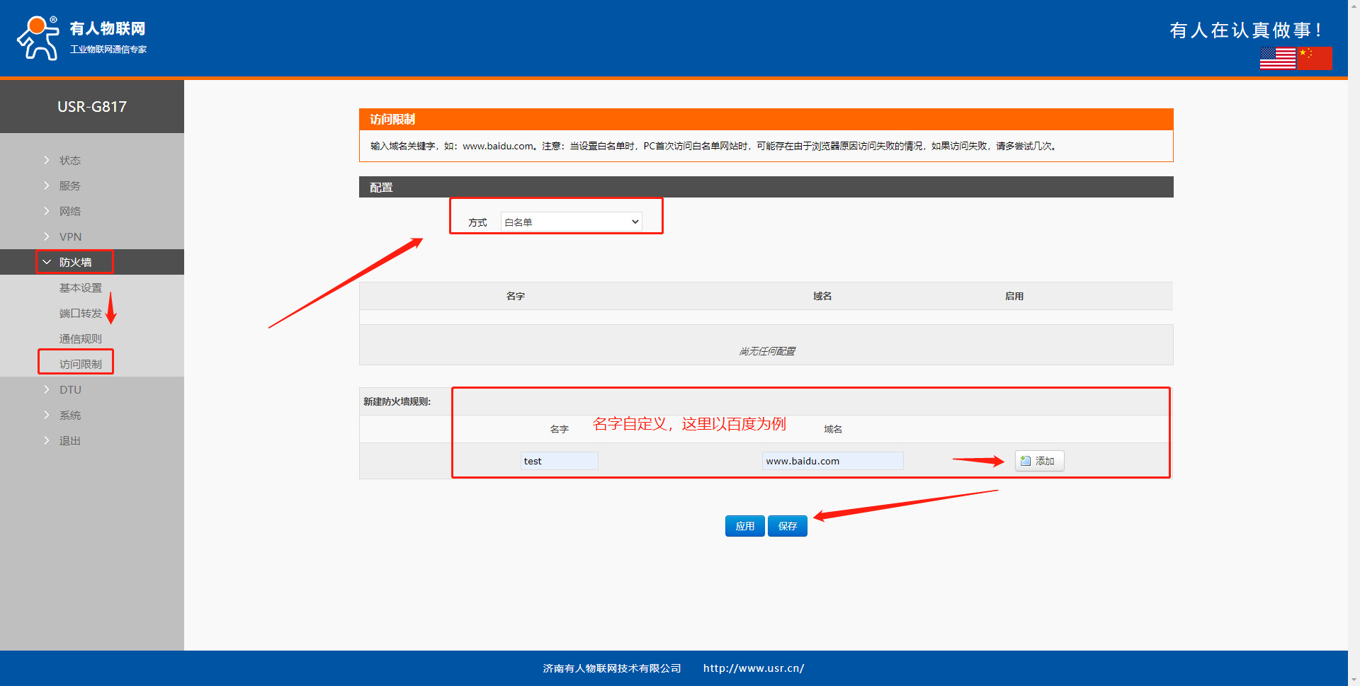 <1>方式選擇白名單,新建防火墻規(guī)則中名字可自擬,域名即為要放行的正確域名,點擊添加,然后點擊報保存,規(guī)則立即生效