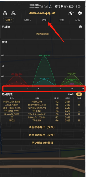 1、可以使用手機下載 cellular-z軟件(手機應用市場均有,也可以百度找一下其他測wifi質量的軟件),使用手機wifi掃描當前各wifi信道應用情況,如下圖