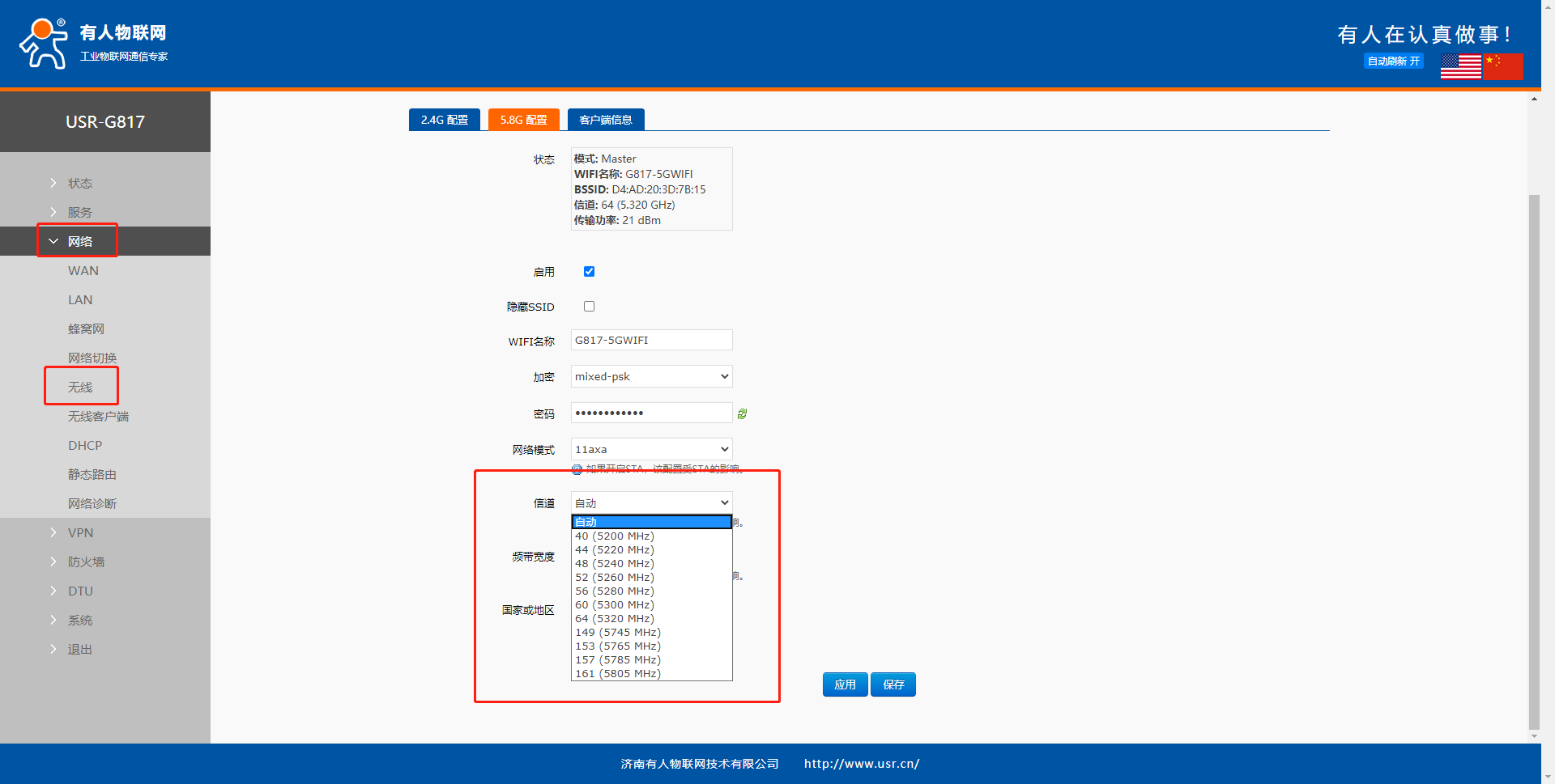 2、進入G817內置網頁后在網絡---無線---點擊2.4G/5.8G---信道選擇現場環境想對空白的信道