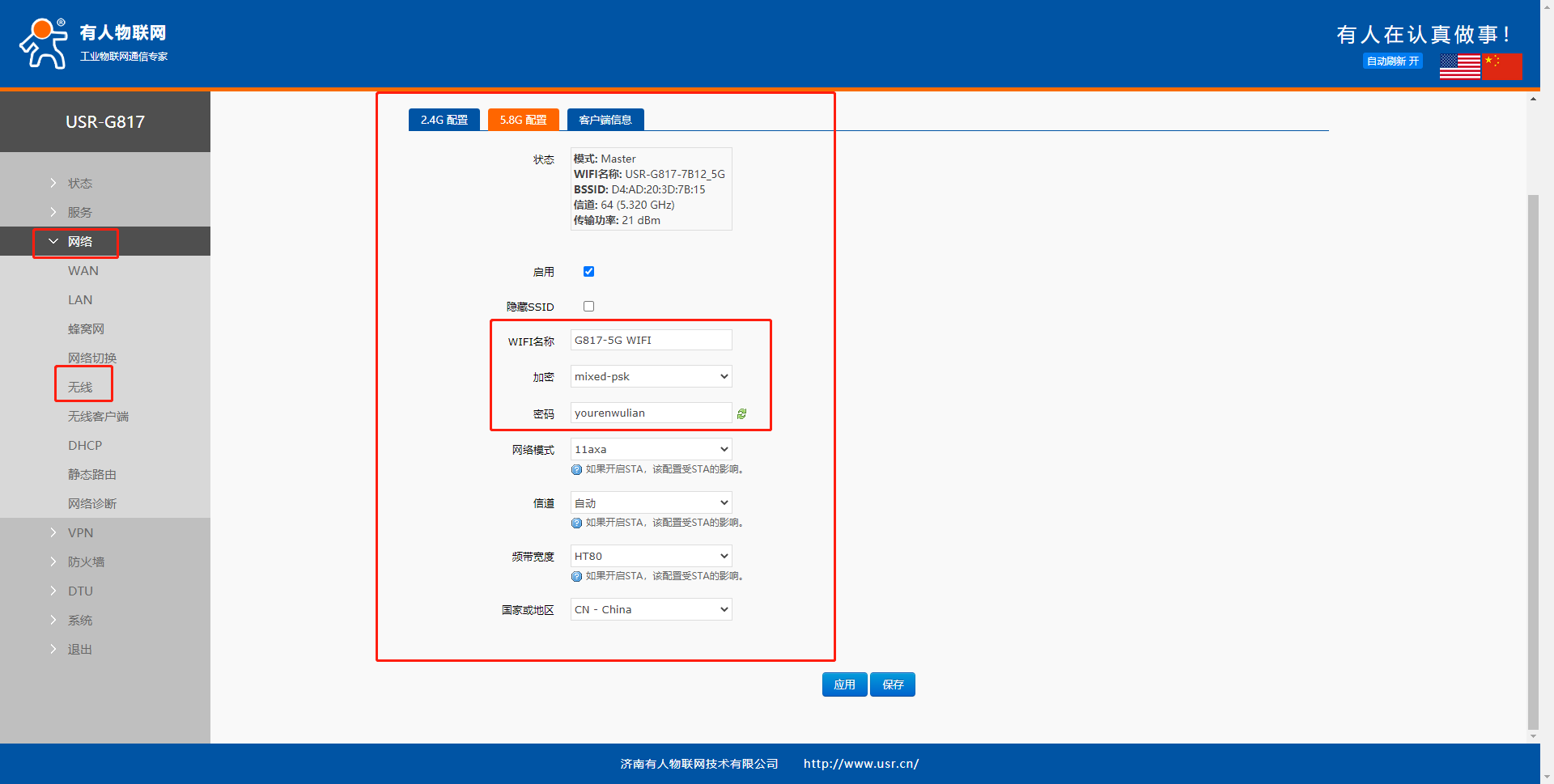 3、進入內置網頁后在網絡---無線---點擊5.8G配置選擇或者自定義wifi名稱、加密方式、設置密碼點擊應用重啟設備