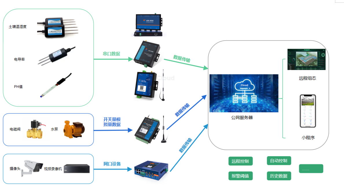 v 若現場終端設備為開關量或模擬量設備,可以通過網絡IO設備將數據傳輸至公網服務器。若現場有4G信號可選用網絡IO中CAT1或G5版本;若現場方便布線或有wifi覆蓋可選用EWR版本;