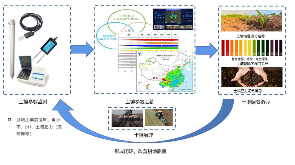 通過對土壤溫濕度、電導率、pH、肥力等數據的監測,數據匯總,提供針對性土壤治理措施,治理過沙或過黏土壤、鹽堿土壤和酸化土壤,提高耕地質量水平。
