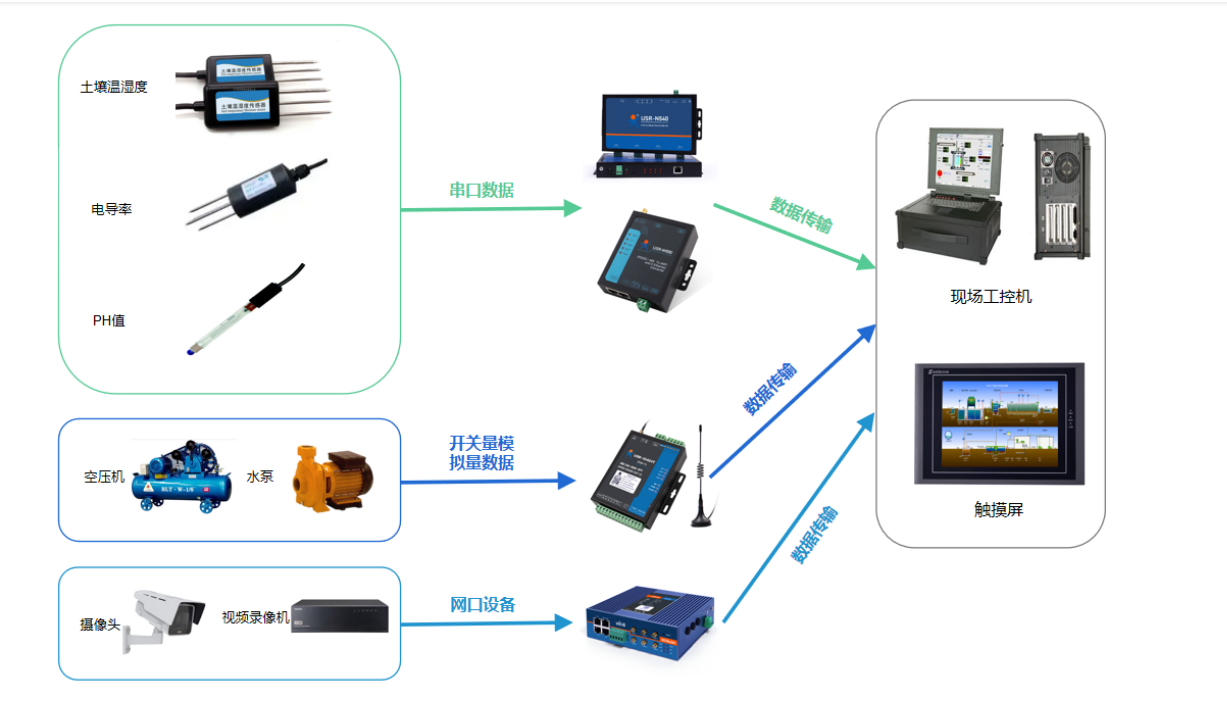 v 若現場終端設備為開關量或模擬量設備,可以通過網絡IO設備將數據傳輸至現場本地工控機或觸摸屏顯示。若現場方便布線或有wifi覆蓋可選用網絡IO中EWR版本;