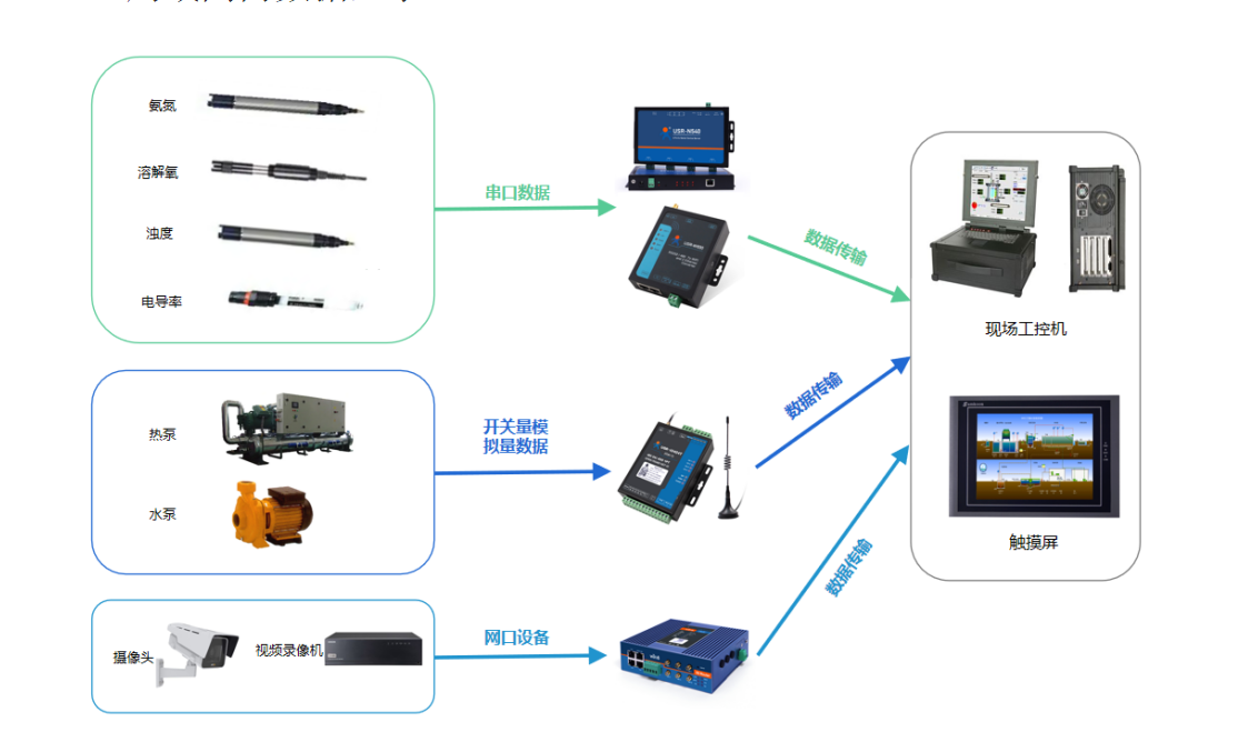 v 若現場終端設備為開關量或模擬量設備,可以通過網絡IO設備將數據傳輸至現場本地工控機或觸摸屏顯示。若現場方便布線或有wifi覆蓋可選用網絡IO中EWR版本;