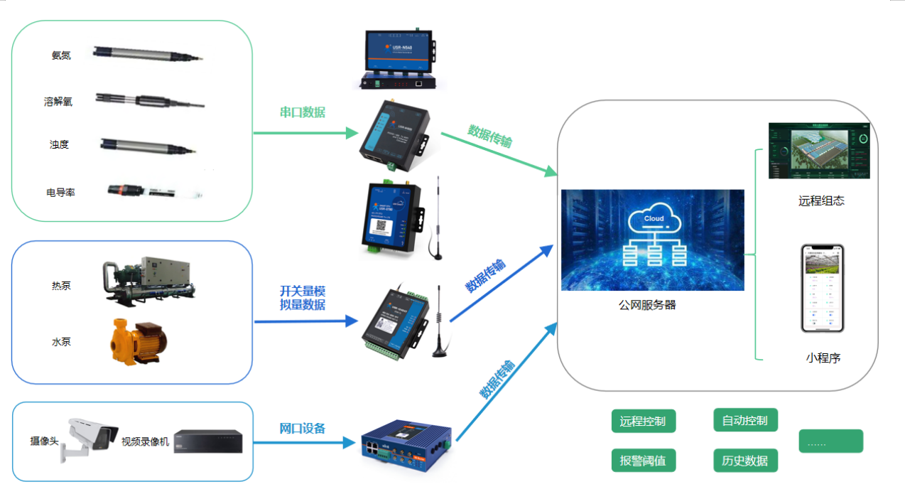 v 若現場終端設備為開關量或模擬量設備,可以通過網絡IO設備將數據傳輸至公網服務器。若現場有4G信號可選用網絡IO中CAT1或G5版本;若現場方便布線或有wifi覆蓋可選用EWR版本;