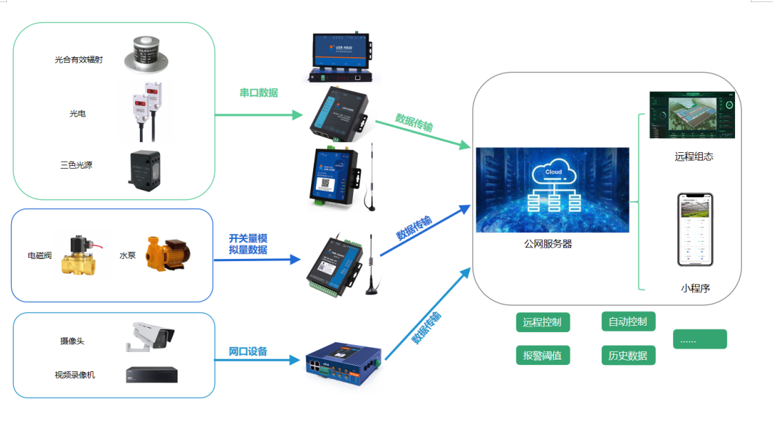 v 若現場終端設備為開關量或模擬量設備,可以通過網絡IO設備將數據傳輸至公網服務器。若現場有4G信號可選用網絡IO中CAT1或G5版本;若現場方便布線或有wifi覆蓋可選用EWR版本;
