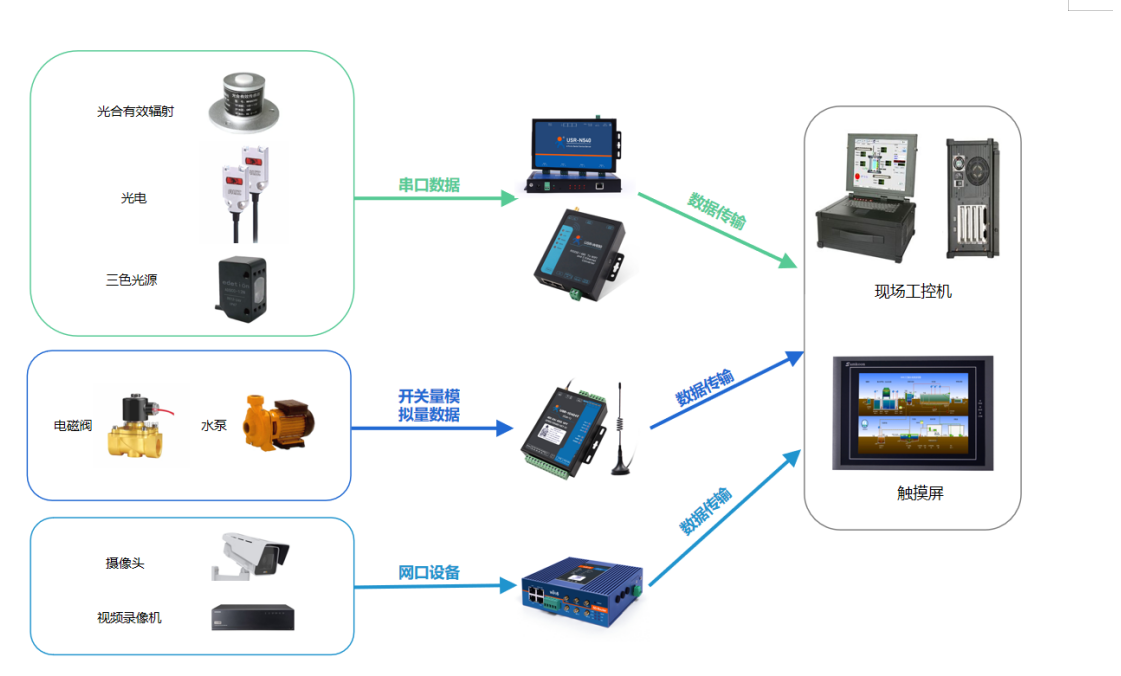 v 若現場終端設備為開關量或模擬量設備,可以通過網絡IO設備將數據傳輸至現場本地工控機或觸摸屏顯示。若現場方便布線或有wifi覆蓋可選用網絡IO中EWR版本;