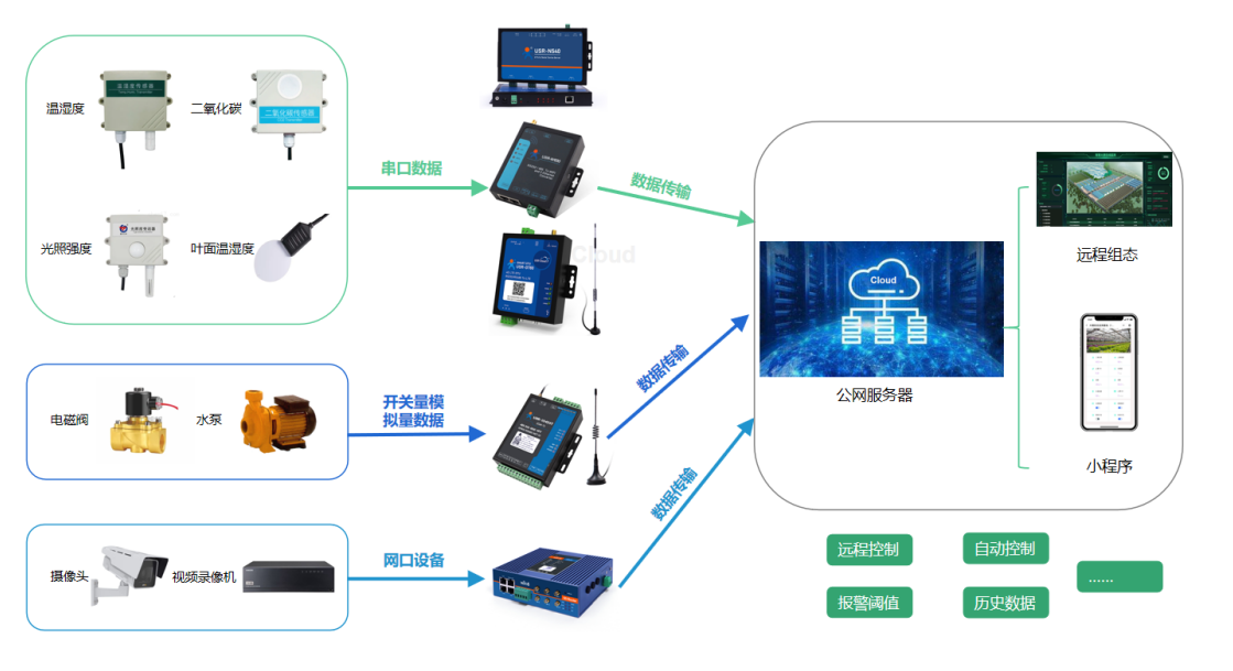 v 若現場終端設備為開關量或模擬量設備,可以通過網絡IO設備將數據傳輸至公網服務器。若現場有4G信號可選用網絡IO中CAT1或G5版本;若現場方便布線或有wifi覆蓋可選用EWR版本;